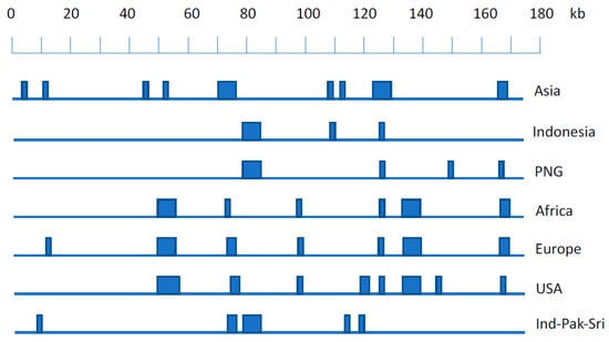 Schematic showing EBV genome locations containing SNPs characteristics for geographic origins of EBV on a scale of the reference NC007605 EBV genome. Vertical bars represent genomic positions of SNPs or haplotypes that are geographic location-specific. Exact details of SNPs specific for each geographic location are given in Table S3 of [23], (details of Ind-Pak-Sri locations will be published elsewhere, but are available on request). PNG is Papua New Guinea; Ind-Pak-Sri is India, Pakistan, Sri Lanka.