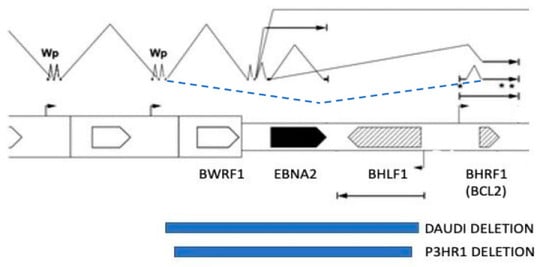 Genomic locations of Daudi and P3HR1 BL deletions (blue boxes) that result in increased expression of the BHRF1 protein from the spliced mRNAs, which normally express the EBNA proteins. Black lines above the open reading frame map indicate the spliced transcripts produced by intact EBV genomes. The novel RNA splicing from the W2 exon near Wp to the BHRF1 coding exon in BL cells with this deletion [41] is shown as a dashed line (blue). Symbols * are BHRF1 miRNAs.
