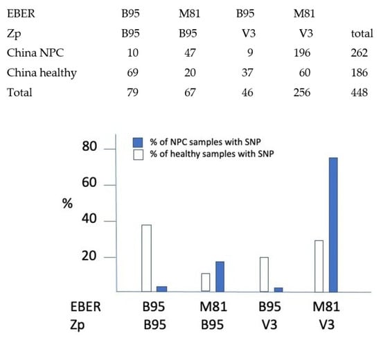Incidence of the different combinations of EBER2 and Zp SNPs in Chinese EBV strains, comparing viruses from NPC disease with healthy controls. x-axis shows the different possible combinations of Zp and EBER SNPs, classified into either B95 (the sequence of the reference B95-8 western strain) or the Zp-V3 and EBER2-M81 SNPs described in the text. Chi squared test shows a highly significant increase (p = 1 × 10−27) in NPC cases in people whose EBV contains both EBER2-M81 and Zp-V3 SNPs.