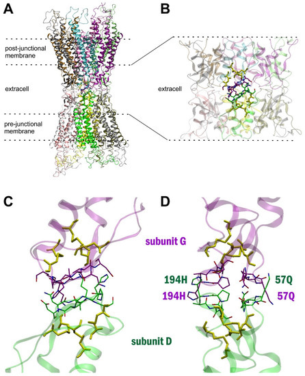 Structural design of amino acid residues filling the gap. (A): Full view of the Cx43 GJC homology model. Subunits are represented by different colours. (B): Extracellular loops of the Cx43 GJC homology model. Subunits are represented by different colours. Residues directly forming the GJ interface are shown in stick. (C,D): Mirror-apposition of pre-GJ “D” and post-GJ “G” subunits (cf. SI Figure S3) showing amino acid residues within 10 Å both from the conserved pre- and post-GJ cystine disulfide frontiers from inside (C) and side (D) views. Green and purple sticks represent the amino acid residues of each subunit within 10 Å from the conserved cystine disulfides, shown in yellow sticks. EL2 194H and EL1 57Q residues are highlighted, indicating outer and inner gap boundaries, respectively.