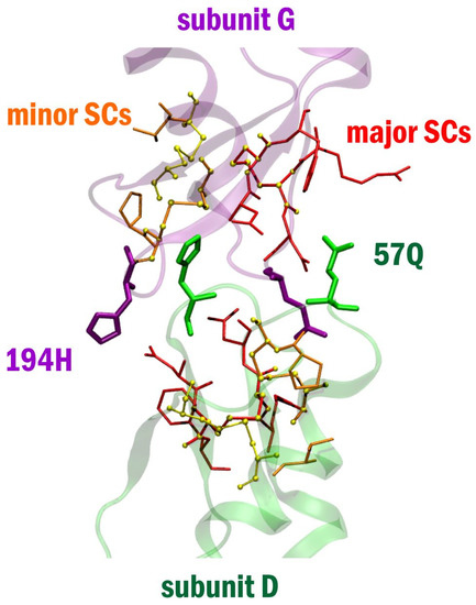 Inter-loop stabilization centers in the Cx43 GJ interface domain. Colour code: green cartoon—subunit D; purple cartoon—subunit G; major stabilization centers (53R, 54C, 55N, 197D, 198C, 199F) are shown in red thin stick, minor stabilization centers (61C, 64V, 191P, 192C) are shown in orange thin stick. Cystine disulfides are shown in thin yellow stick. Atoms of cystine disulfides are also marked by yellow ball to allow their visualization in case they are involved in stabilization centers as well. 57Q, 194H are shown in thick stick colored according to the subunit they belong to.