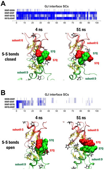 Forming of GJ interface SCs 55N-56T-57Q is governed by neighboring Cys residues. (A): Dynamics of GJ interface SCs between the D and G subunits during the closed disulfide MD run of Cx43 GJC (top). Bottom: 55N, 56T and 57Q residues (shown by surface representation) constitute the GJ interface stabilization centers (SCs) between the opposing subunits D (green) and G (red). The GJ interface SCs are fairly stable during the 100 ns molecular dynamics simulation. (B): Dynamics of GJ interface SCs between the D and G subunits during the open disulfide MD run of Cx43 GJC (top). Bottom: opening of S-S bonds at the beginning of the simulation leads to weakening of SC contact interactions between the 55N-56T-57Q surfaces and disruption of the SCs (bottom row). Color code: green–subunit D; red–subunit G; yellow–Cys residues; gray–Pro residues.