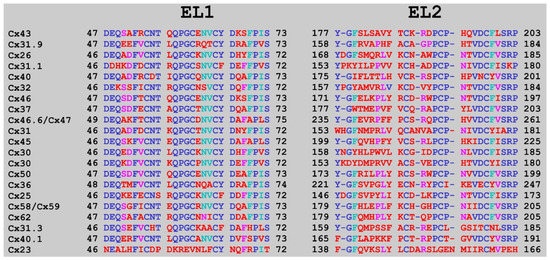 The inner EL1 features few non-conserved residues linking several conserved sequence-motifs (Figure 6). The encoded arrangement suggests a designer role for EL1 in connexon coupling and GJC pore formation. When associated via the cystine disulfide linkage, the less-conserved outer EL2 (Figure 6) can further contribute to junctional subtype-specificity. These considerations also justify the search for finding Cx subtype-specific inhibitors interfering connexons coupling to Cx GJC.