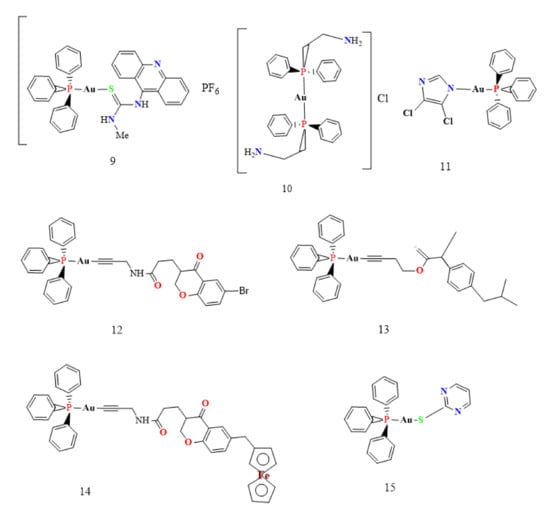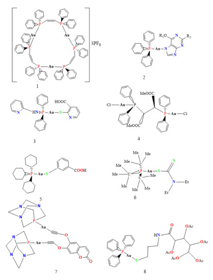 The IC50 values reported in Table 1 were obtained for gold(I) phosphane compounds having different chemical coordination linking around the gold center and various ligands. In Scheme 2, some representative molecular structures of the compounds quoted in Table 1 are reported.
