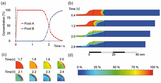 The concentration curve for both fluids at the cartridge outlet is shown in Figure 1a (additional Movie S1). When running the simulation with no slip conditions assumed at the cartridge walls, a core-shell effect of both materials was found (Figure 1c) in addition to mixing, as reported earlier [45]. Furthermore, the residual material A at the cartridge walls was extruded after the piston met the piston crown.