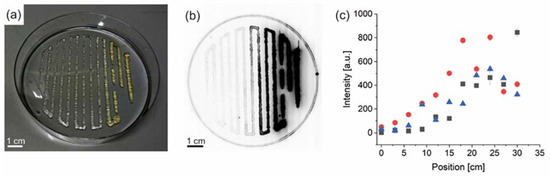 Three-dimensional printed gradient of recombinant spider silk hydrogels (3% w/v) with one spider silk component fluorescently labeled. (a) Photograph of gradient hydrogel constructs from non-labeled (left) to fluorescently labeled spider silk proteins (yellow, right). (b) Gradient fluorescence signal visualization of the same sample as in a. (c) Quantification of the fluorescence signal at distinct locations along the printed strand from non-labeled (left) to labeled (right) spider silk proteins; red, blue, and black symbols represent measurements for three identical scaffolds as statistic repeats.