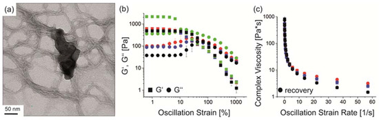 One important property of eADF4(C16) hydrogels is their shear thinning behavior [31,33,34,37]. In the presence of FAp particles, the hydrogels showed shear-thinning behavior known for non-Newtonian fluids at increasing shear rates and recovery at decreasing shear rates, which is important to gain solid structures after strand deposition upon printing (Figure 3c). Similar behavior was found for recombinant silk particle-enforced [35] and silica particle-enforced [36] hydrogels.