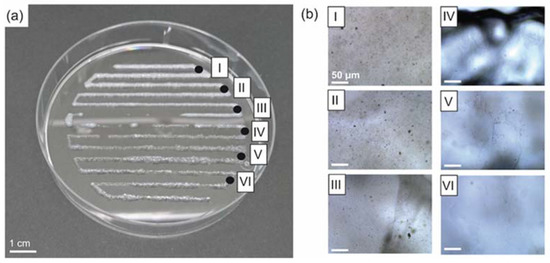 Gradient printing of recombinant spider silk hydrogels in the presence of FAp particles (material A) and in their absence (material B) was realized (Figure 4a) with the identical printing parameters as used for single-material hydrogels. There was a slight dewetting effect on the substrate, visible between positions II and IV (Figure 4a), without influencing the general outcome. Light microscopy images at distinct positions revealed a decreasing particle density in the hydrogel (Figure 4b, I–VI). Small particle aggregates in the lower micrometer range were visible, especially in regions with higher particle concentrations due to particle aggregation during extrusion through the nozzle.