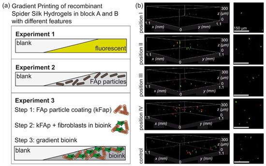 For gradient bioprinting of cells, 106 cells/mL were encapsulated (at passage 10) with 15% cell culture media in 3% w/v spider silk pre-gel solutions complemented with 1% w/v eADF4(κ16)-coated FAp particles and gelled at 37 °C. Cell viability was confirmed using trypan blue (Sigma-Aldrich, St. Louis, MO, USA) in a Cell Titer Blue Assay and an automated cell counter (TC20, Bio-Rad, Hercules, CA, USA). Cells were live-dead stained with calcein acetoxymethylester (abbreviation: calcein AM) and ethidium homodimer I (Invitrogen, Thermo Fisher Scientific, Waltham, MA, USA) for 45 min before imaging.
