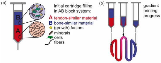 The simultaneous processing of apatite particles with a cell-friendly protein coating along with BALB/3T3 cells showed that this printing set-up offers not only the possibility to generate gradients from one printer cartridge but also to incorporate multiple gradient features into one scaffold (here, particles and cells), relevant for, e.g., biofabrication of tissues at the tendon-bone interface [51]. Various additional features and fillers could be added in future studies (Figure 6).