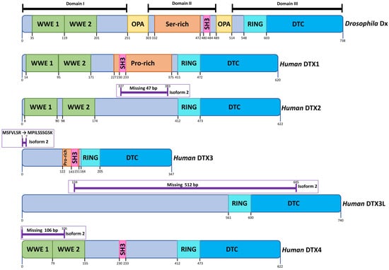 Human Deltex Isoforms. DTX proteins all have in common a conserved C-terminal region comprising a RING domain E3 ubiquitin ligase and a DTC domain. Drosophila Deltex can be divided into three subdomains (I–III) separated by poly Q rich regions (OPA). DTX1, DTX2, DTX4 and Drosophila Deltex have in common 2 WWE domains, which are Notch-binding regions that interact with the Ankyin domain region of the Notch ICD. Proline-rich regions, in some cases including the PPLP motif that comprises SH3 binding sites, are indicated where present. Drosophila Deltex additionally has Q-rich repeat regions (OPA repeats), which separate the N- and C-terminal domain regions from the central Serine-rich region. Variations arising from alternative splicing are indicated on the figure with horizontal purple lines (https://www.uniprot.org, accessed on 18 October 2021) [].