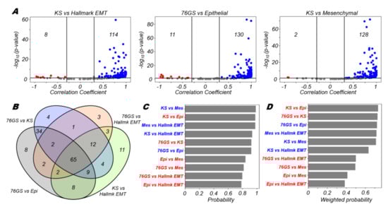 Consistency between different EMT scoring metrics. (A) Volcano plots depicting the Pearson correlation coefficient and the −log10(p-value) for 3 pairs of EMT scoring metrics: KS vs Hallmark EMT, 76GS vs epithelial and KS vs mesenchymal. Vertical boundaries are set at correlation coefficients −0.3 and 0.3. The cut-off for p-value is set at 0.05. (B) Four-way Venn diagram for comparison of 4 representative pairs of EMT scoring metrics. (C) Probability of a dataset having a positive (blue) or a negative (red) correlation (correlation coefficient > 0.3) given that it is significant (p-value < 0.05) for different pairs of EMT scoring metrics. (D) Probability of a dataset having a positive (blue) or a negative (red) correlation (correlation coefficient > 0.3) given that it is significant (p-value < 0.05) weighted by the fraction of significant cases for different pairs of EMT scoring metrics.