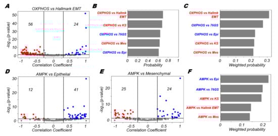 Through quantifying the trends of association of the AMPK signature with various EMT metrics, we noticed that the probability of a positive correlation between AMPK and epithelial metrics (epithelial signature, 76GS scores) was higher than that of a negative correlation between AMPK and mesenchymal ones (KS score, hallmark EMT, mesenchymal signature) (Figure 2F). These observations suggest that AMPK is strongly coupled with epithelial traits of cells, rather than with their mesenchymal ones. However, we noticed OXPHOS is strongly negatively correlated with both hallmark EMT signature as well as the mesenchymal signature (Figure 2A,B). This difference seen between trends in AMPK and OXPHOS may be due to additional context-specific factors, apart from AMPK, that might also mediate the crosstalk between the EMT and OXPHOS [], thus leading to an overall stronger negative association of OXPHOS with the hallmark EMT program (Figure S3).