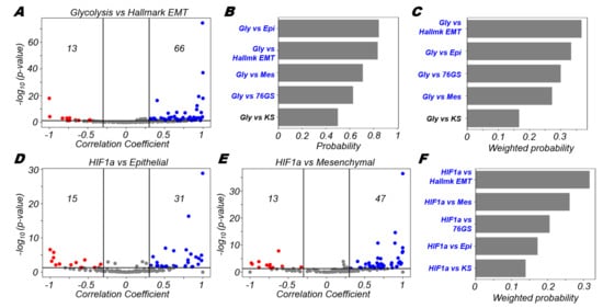 Glycolysis is more likely to correlate positively with EMT. (A) Volcano plots depicting the Pearson correlation coefficient and the −log10(p-value) for hallmark glycolysis and hallmark EMT signatures. (B) Probability of a dataset having a positive (blue) or a negative (red) correlation (correlation coefficient > 0.3) given that it is significant (p-value < 0.05) for glycolysis and different EMT scoring metrics. (C) Probability of a dataset having a positive (blue) or a negative (red) correlation (correlation coefficient > 0.3) given that it is significant (p-value < 0.05) weighted by the fraction of significant cases for glycolysis and different EMT scoring metrics. Volcano plots depicting the Pearson correlation coefficient and the −log10(p-value) for (D) HIF1α signature and epithelial signature, (E) HIF1α signature and mesenchymal signature. (F) Probability of a dataset having a positive (blue) or a negative (red) correlation (correlation coefficient > 0.3) given that it is significant (p-value < 0.05) weighted by the fraction of significant cases for HIF1α signature and different EMT scoring metrics. Vertical boundaries for volcano plots are set at correlation coefficients −0.3 and 0.3. The cut-off for p-value is set at 0.05.
