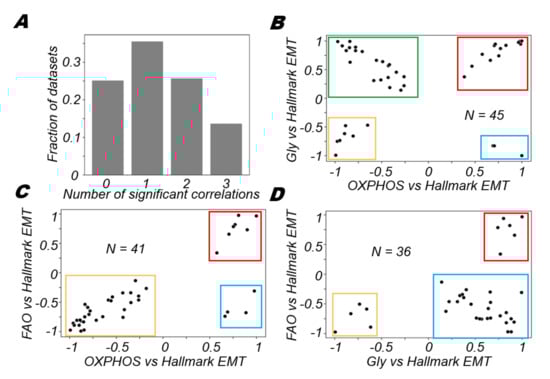 Varied associations between different metabolic axes with the EMT. (A) Proportion of datasets that have a given number of metabolic axes significantly correlated with the hallmark EMT signature (p-value < 0.05). Scatter plot of correlation coefficients of (B) OXPHOS with the EMT and glycolysis with the EMT, (C) OXPHOS with the EMT and FAO with the EMT and (D) glycolysis with the EMT and FAO with the EMT.