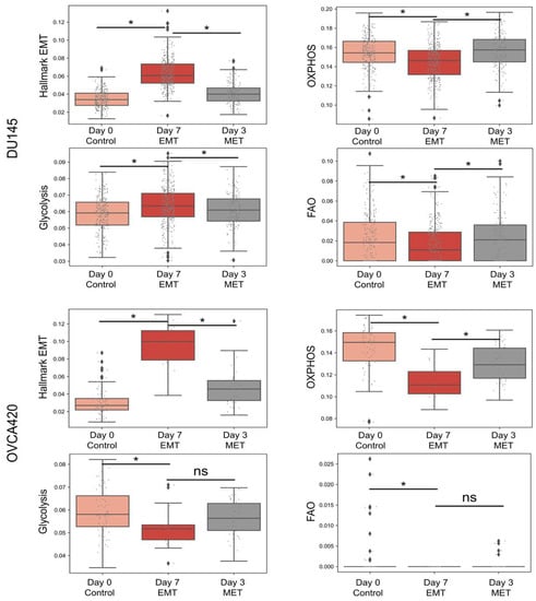 Metabolic signatures in single cell RNA-seq data upon EMT induction. Box plots for ssGSEA scores of hallmark EMT and metabolic signatures—glycolysis, OXPHOS and fatty acid oxidation—at day 0 (untreated) and day 7 (upon TGFβ treatment) and day 3 withdrawal of TGFβ (after 7 day treatment) for different cell lines: (A) DU145 (B) OVCA420. ‘ns’ indicates non-significant (p > 0.05); *: p < 0.05 using a Students’ t-test.