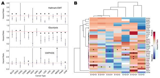 Survival metrics for metabolic signatures in TCGA samples. (A) Plot of log2 hazard ratio (HR; mean ± 95% confidence interval) comparing overall survival (OS) with EMT, glycolysis and OXPHOS ssGSEA scores for different TCGA cancers and cohorts. p-values are based on log-rank test, and those with significant differences (p < 0.05) are marked with an asterisk (*). (B) Heatmap of log2 hazard ratio in different combinations of EMT, glycolysis, and OXPHOS when the reference is E-G-O- (EMT low/glycolysis low/OXPHOS low). Blue depicts HR < 1 and red depicts HR > 1; higher values are represented by more intense colours.