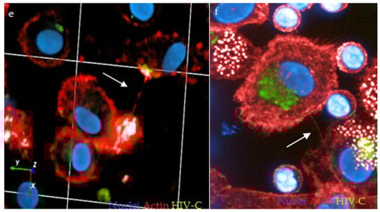 Interestingly, HIV-C-loaded iDCs as well as mDCs displayed a significantly higher number of TNTs on their surface when co-cultured with CD4+ T cells (Figure 1a,b) which is particularly impressive when the inevitable loss of some of these structures during chemical fixation is considered []. Not only in DC/CD4+ T-cell co-cultures (Figure 1a,b) but also in cultures of DCs alone, HIV-C enhanced TNT formation, but at significantly lower levels compared to the DC/CD4+ co-culture (Figure 1c,d), highlighting the importance of CD4+ T cells for DC reticulation []. From qualitative observations, TNTs seem to especially form between heavily infected cells (Figure 1e). Moreover, HIV-C was observed in proximity of TNTs (Figure 1f), in line with recent studies, where HIV-like particles were demonstrated to spread from one DC to another through TNTs [].