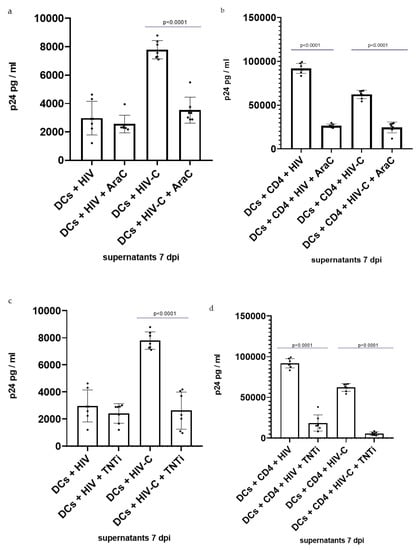 Briefly, in a 96-well U-bottom plate (Greiner Bio-One, Kremsmünster, Austria), 105 cells in 100 µL/well (in a ratio of 2 CD4+ T cells/1 DC in co-cultures) were infected with 25 ng p24/mL of HIV/HIV-C or left uninfected. To confirm productive infection with HIV-1, we thoroughly washed the cells after 24 h and cultured cells at 37 °C/5% CO2. Using ELISA, we measured the p24 concentrations in the supernatants after spinning down the plate to pellet cells at 7 dpi.
