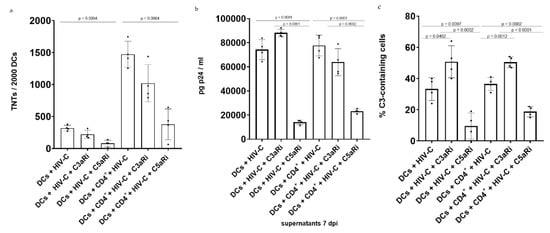 3.4. Antagonizing C5aR Reduces TNT Formation, Infection and Local C3 Production in HIV-C-Infected DCs and DC/CD4+ T-Cell Co-Cultures