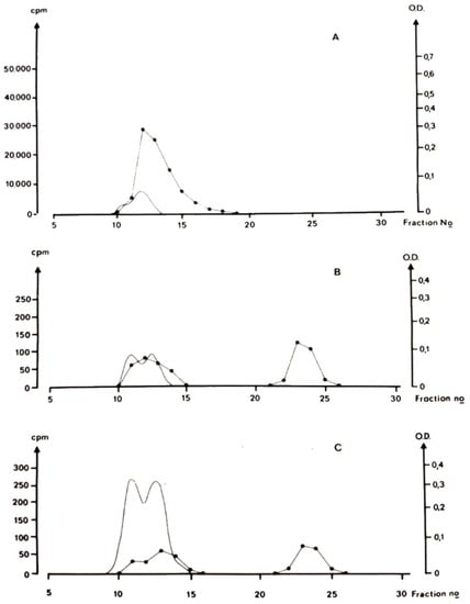 Binding of cadmium in blood plasma. The panels show the results of gel-chromatographic (G75) separation (at +5 °C) of blood plasma from mice at various time points after s.c. injection of a single dose of radiolabeled CdCl2. (A): 20 min after injection, (B): 96 h after injection, (C): 192 h after injection. At the shorter time (20 min) all Cd appeared in a high molecularweight peak (fractions 12–14). At longer longer times (B,C), when the concentration of Cd in plasma was 9 nanomol/kg, a considerable proportion of plasma Cd was detected in a second peak (fractions 23–24) at the molecular size of MT. Line with dots: radiocadmium, unbroken line optical density 254 nm (OD). (Picture of Original drawing of chromatographic results. Experimental details described in [27]).