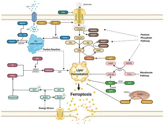 Energy stress is one of metabolic stress, characterized by the increase in intracellular AMP and the consumption of intracellular ATP. Adenosine monophosphate (AMP)-activated protein kinase (AMPK) is crucial to energy stress by stimulating the ATP-producing catabolic processes and inhibits ATP-consuming anabolic processes [50]. Activation of AMPK in energy stress increases phosphorylation of acetyl-CoA carboxylase (ACC), thus hindering the synthesis and oxidation of fatty acids, which illustrates how energy stress inhibits ferroptosis [51]. A study also reports that AMPK promotes ferroptosis by phosphorylating BECN1 (beclin 1), binding to SLC7A11, then inhibiting cystine transport [52]; therefore, the precise effect of energy stress or AMPK needs further investigation.