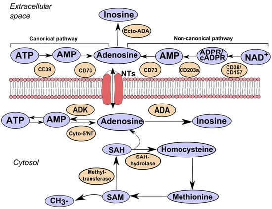 Adenosine metabolism. The canonical pathway of adenosine synthesis involves the hydrolysis of ATP to AMP by ecto-nucleoside triphosphate diphosphohydrolase (NTPDase1, CD39) and the hydrolysis of AMP by ecto-5′-nucleotidase (5′NT, CD73). The non-canonical pathway involves the use of NAD+ as a substrate by CD38 or CD157 to generate ADP-ribose (ADPR) directly or through its cyclic form (cADPR). ADPR is then processed to AMP by CD203a (Ectonucleotide Pyrophosphatase/Phosphodiesterase 1). Extracellular adenosine can bind to its receptors or be metabolized to inosine by ecto-adenosine deaminase (ecto-ADA). Adenosine is transported into and out of the cell by concentrative or equilibrative nucleoside transporters (NTs). Intracellular adenosine synthesis is controlled by the balance of the activity of enzymes: adenosine kinase (ADK), cytoplasmic 5′nucleotidase (Cyto-5′NT), adenosine deaminase (ADA). Adenosine is generated as an end product in the transmethylation reaction: transmethylation reactions include the transfer of methyl groups from S-adenosylmethionine (SAM) to a wide range of acceptors. The resulting product, S-adenosylhomocysteine (SAH), is then cleaved by SAH hydrolase (SAHH) into adenosine and homocysteine.