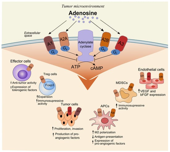 Receptors A1 (A1R) and A2A are highly affine to adenosine. In physiological conditions, adenosine functions via these receptors, while A2B and A3 are low affine receptors []. The type of G proteins activated in the stimulated cells determines the effect of each adenosine receptor. A1R and A3R are associated with Gi, Gq, and Go proteins. The A1R or A3R ligation on the immune cells can activate immune reactions due to the inhibition of adenylate cyclase activity and a decrease in the levels of cAMP. A2AR and A2BR are Gs-coupled. They induce the enzymatic activity of adenylyl cyclase and increase the intracellular level of cAMP. Besides, through cAMP activation, adenosine receptors are associated with MAPK, PKA, and EPAC signaling that control gene transcription, metabolism, proliferation, and apoptosis, which are important for tumor progression [,].