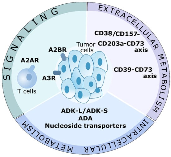 Targeting adenosine in cancer therapy. Possible adenosine-associated targets for cancer therapy. Signaling, and extracellular and intracellular metabolism may be involved in limiting the immunosuppressive action of adenosine. Possible therapeutic targets are A2A receptors (A2AR) on T cells, and A2B and A3 receptors on tumor cells. Like a part of the extracellular metabolism, the CD39-CD73 axis and the CD38/CD157-CD203a-CD73 axis are actively investigated in clinical trials. Targeting adenosine-cleaving enzymes, ADK and ADA, as well as nucleotide transporters, may become a new direction in cancer therapy. Of particular interest is ADK-L, which is involved in epigenetic regulation.