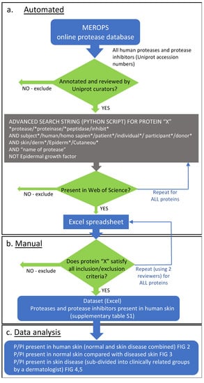 Modified systematic review methodology. (a) Automated search: accession numbers for all human proteases and protease inhibitors (P/PIs) from MEROPS were validated against Uniprot/Swiss-Prot to confirm annotation, alternative names and review status; all human P/PI names queried in Web of Science using defined search parameters; data output was a list of articles for each P/PI in an Excel spreadsheet. (b) Manual review: articles for each P/PI reviewed and accepted/rejected according to defined inclusion/exclusion criteria; data output was a list of P/PIs (the dataset can be found in Supplementary Table S1) present in normal human skin and skin disease. (c) Data analysis: presence of P/PIs in all human skin types (normal and disease), presence of P/PIs in normal skin compared with skin disease, presence of P/PIs in skin disease, sub-divided into clinically relevant disease groups.