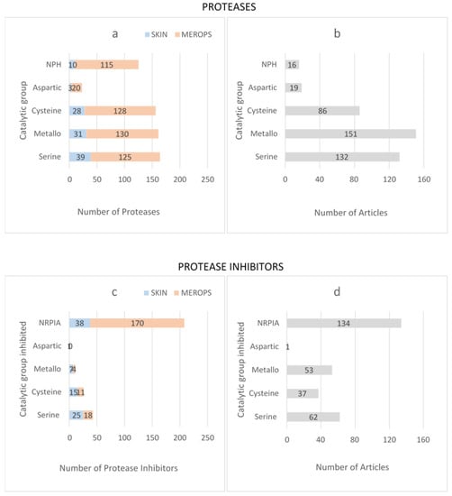 Number of P/PI in human skin, categorised according to catalytic family (protease) or catalytic family that is inhibited (inhibitors). (a) Total number of proteases identified in human skin compared to total number of human proteases in MEROPS, grouped according to catalytic family (NPH = non-peptidase homolog. For clarity this group also contains uncharacterised homologs and pseudogenes). (b) Total number of published articles grouped according to protease catalytic family. (c) Total number of protease inhibitors identified in human skin compared to total number of human protease inhibitors in MEROPS, grouped according to the catalytic family that they inhibit (NRPIA = no reported protease inhibitory activity). (d) Total number of published articles grouped according to catalytic families that are inhibited.