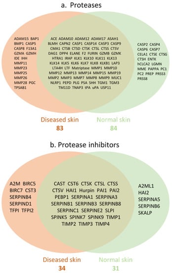 The number of proteases in normal skin and diseased skin is equivalent, although the profile of individual proteases is distinct. This could suggest that the core proteases which are present in diseased states may be actively translated in normal skin; however, because it is difficult to fully determine the relative abundance of individual proteases in this study, differences in protein expression in normal skin and diseased skin cannot be ruled out. However, MMP15 (MT2-MMP), which is present in the inflammatory dermatoses group but not normal skin, in the current study, is elevated in psoriasis plaques compared with peri-lesional skin []. Because MMP15 can cleave a wide variety of ECM components (fibronectin, laminin, tenascin-C, aggrecan and perlecan), in addition to inflammatory (MMP2 and TNF-alpha) and angiogenic (ADAMTS1) factors [,], it would be interesting to further explore the role of MMP15 in normal and inflamed skin.