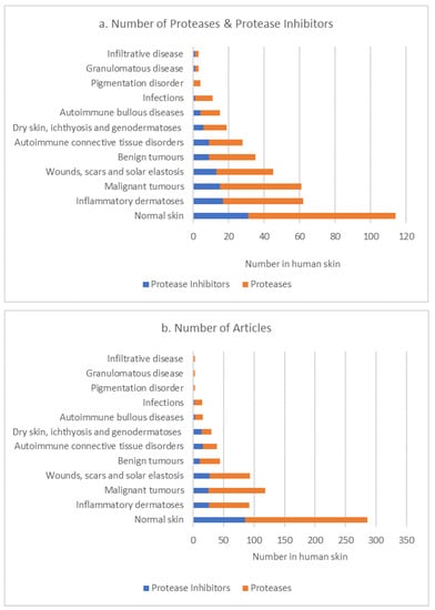 The dataset was next investigated to determine whether the P/PI profile changed according to the type of skin disease. Individual skin diseases were allocated to a skin disease group by a clinical dermatologist (author, T.W.G.). For cutis laxa and acne vulgaris, an individual disease group was not clearly identified. In this case, these diseases/conditions were allocated to more than one disease group (Supplementary Table S2). The number of P/PIs present in skin showed an apparent difference according to the disease group (Figure 4a); however, this may be due to publication bias as the number of published articles associated with each disease group follows the same trend (Figure 4b). Cathepsin-D and cathepsin-B; MMP9; CMA1, uPA and tPA, as representatives of the aspartic, cysteine, metallo- and serine protease families, respectively, were the most frequently identified proteases across all disease groups (including normal skin). Protease inhibitors A2M, cathepsin-L, TIMP1 and PAI2, representing inhibitors of the aspartic, cysteine, metallo- and serine protease families, respectively, were the most frequently identified across all disease groups (including normal skin). It is of interest that MMP23, which was absent in normal skin, was present in four skin disease groups.