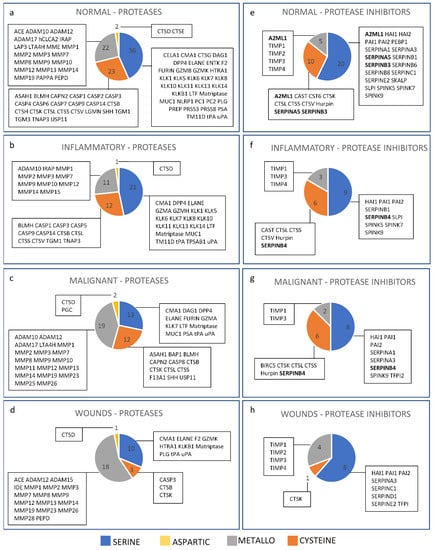 P/PI in normal skin, inflammatory dermatoses, malignant tumours, and wounds, scars and solar elastosis, grouped according to catalytic family (proteases, (a–d)) or catalytic family inhibited (protease inhibitors, (e–h)). Protease inhibitors in bold show inhibitors that target more than one catalytic family.