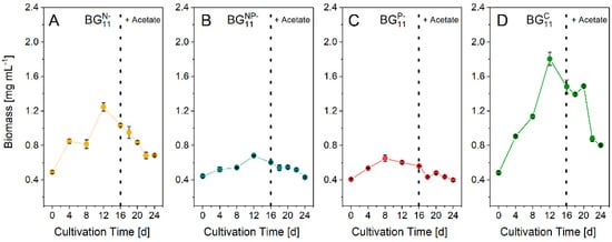 Biomass formation under N-deficiency ((A), BG11N−), N- and P−deficiency ((B), BG11NP−), P-deficiency ((C), BG11P−), and without deficiency ((D), control, BG11C). The dashed vertical line indicates the addition of 2 g L−1 sodium acetate and the beginning of the mixotrophic stage. Data are the mean ± SD of three replicates.