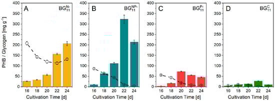 PHB (columns) and glycogen formation (dashed line) under N-deficiency ((A), BG11N−), N- and P-deficiency ((B), BG11NP−), P-deficiency ((C), BG11P−), and without deficiency ((D), control, BG11C), and supplementation with 2 g L−1 sodium acetate. Data are the mean ± SD of three replicates.