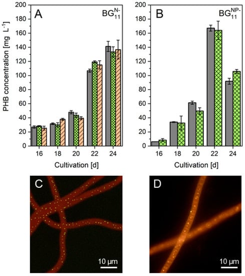 Consequently, a lack of P during the phototrophic stage led to a decreased glycogen productivity and thus reduced the formation of PHB. P-deficiency also had a substantial negative impact on growth, which was almost completely stopped in the P-deficient cultures BG11NP− and BG11P− (Figure 1). Nevertheless, the highest PHB content was obtained in BG11NP− (Figure 2B). Acetate accelerated the PHB formation and ensured PHB increment within a short time. Although the PHB content of 20.6 wt% in N-deficient culture was lower than that of the NP-deficient culture (32.3 wt%), the higher biomass concentration resulted in a comparable PHB concentration of 141.5 mg L−1 compared to 167.3 mg L−1 (NP-deficiency). Therefore, N-limitation is beneficial for large-scale applications, since (i) biomass productivity does not stop during the N-deficient stage, (ii) high glycogen productivity (Figure 2) was observed, and (iii) the dormant state (chlorosis) supports PHB production and cell survival. A prolonged cultivation period might result in even higher yields. High PHB concentrations were obtained in similar studies (Table 2).