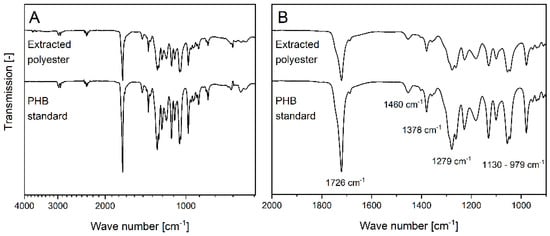 FTIR spectrum of PHB extracted from Leptolyngbya sp. NIVA-CYA 255 and PHB standard (A). A zoom into wave numbers ranging from 2000 to 800 cm−1 (B).