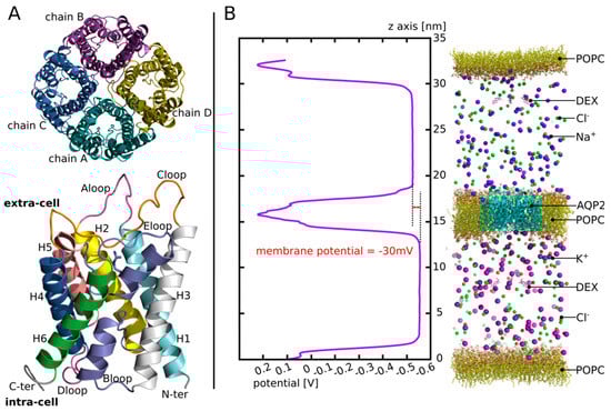 Aquaporins are transmembrane proteins (Figure 1A) which allow the transfer of water molecules across the biological membranes of most living cells [11,12,13]. Among them, aquaporin 2 (AQP2) has particularly aroused the interest of researchers due to its role in the control of transmembrane water fluxes [14,15,16] and because it is expressed in areas of fluid exchange between the perilymph and endolymph [10,15,17,18,19,20]. A conformational state of the AQP2 tetramer corresponding to open and functional water channels indeed allows, under the effect of the electrochemical gradient, a transfer of water between the two adjacent fluid compartments of the inner ear. This peculiarity makes it a prime target to explain the phenomenon of EH, in the event of a mutation that would affect the structure or the function of AQP2 [21,22].