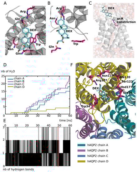 First, to find a putative interaction site for dexamethasone in AQP2, we used the X-ray structure of the mouse agonist glucocorticoids receptor interacting with dexamethasone (PDB code: 3mne [44]) as a reference (Figure 2A). From this structure, we can notice the protein residues of the interaction site complement the amphipathic nature of the dexamethasone very well. Indeed, we found both polar and charged residues, such as asparagine, glutamine or arginine, and hydrophobic ones, such as isoleucine or tryptophane (Figure 2A). Tryptophane can also act as a hydrogen bond donor and is hence able to accommodate both polar and hydrophobic parts of the dexamethasone. When we compared this interaction site with the extracellular vestibules of AQP2, we found the above-mentioned features were conserved. On this part of the AQP, an arginine, an asparagine, a glutamine and a tryptophane were found (Figure 2B). Plus, the intrinsic amphipathic nature of the conducting pore [45,46] characterized by the opposition between polar water molecules interaction sites and hydrophobic slides leads to very similar features. This amphipathic nature of the AQP-conducting pore allows very stringent and selective conduction properties [39] but could also accommodate other amphipathic molecules, such as dexamethasone. In addition to this similar nature, with the native interaction site of dexamethasone, the extracellular vestibules of AQPs also present a very conserved residue among the family: the arginine of the aromatic/arginine (ar/R) constriction [11]. This ar/R constriction is named after this arginine and is well known to be determinant in the function of the protein, for example, it is called the selectivity filter of the pore. This constriction corresponds to the narrowest part of the channel and its role in the selectivity of the channel has been confirmed by both theoretical studies [47,48] and mutation experiments [49]. Indeed, the composition of the constriction changes both the size and the hydrophobic nature of the pore which are understood as the two criteria on which relies the selectivity of the AQP [39]. More recently, several studies further confirmed the critical role of the arginine of the ar/R constriction on the transport properties of the AQP by highlighting significant impact of the position of its side chain in the pore on the water permeability [34,35]. Thereafter, because of the similarities between the extracellular vestibules of AQP2 and the interaction site of the dexamethasone and because of the presence of very conserved residues known for their role in transport properties of AQPs, we decided to investigate the ability of these vestibules to fix dexamethasone. In order to do so, we manually placed one dexamethasone molecule on each four extracellular vestibules of the X-ray structure of human AQP2 (PDB code: 4nef [50]). We mimicked the interactions observed on the X-ray structure of the mouse agonist glucocorticoids receptor: the oxygen of the carbonyl group is positioned close to the arginine, the hydroxyl groups close to the polar asparagine and glutamine while the hydrophobic side of the dexamethasone faces the hydrophobic part of the channel ending at the extracellular surface with the tryptophan (Figure 2A,B).