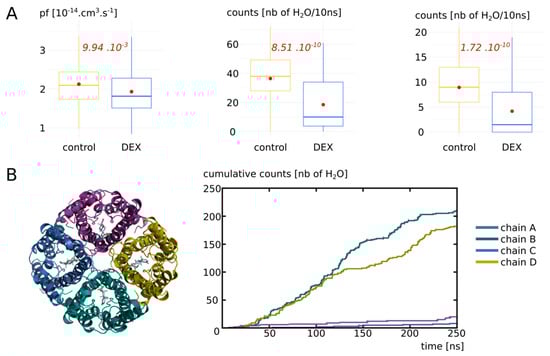 For experimental setup n°2, the 250 ns trajectories were divided into 10 ns subtrajectories and the analyses were performed for each monomer, hence yielding 100 repetitions per condition for Figures 3 and 5, and 25 repetitions per monomer for Figure 4. For the contingency table shown in Figure 4D, the functional state of a channel was established when allowing 5 or more water molecules to cross the whole 30 Å long transmembrane section from 1 compartment to another in 10 ns. This threshold was defined based on the results of permeability comparison between the condition “control” and “DEX” over the 250 ns of trajectory and displayed in Figure 3. The value of 5 water molecules was elected as a functional state threshold because it discriminates both the means and medians of the two conditions.