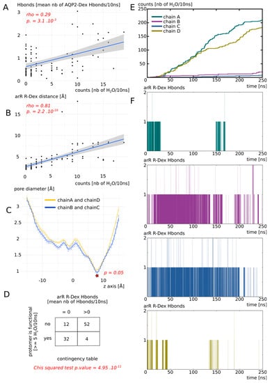 To better understand this heterogeneity of response phenotype between the four monomers, we focused our study on the way dexamethasone impacts water permeability in the “DEX” condition (Figure 4). We first hypothesized that a high number of hydrogen bonds between the dexamethasone and AQP2 would stabilize the interaction and hence correlate with smaller water permeability. However, we observed the contrary, with a high number of hydrogen bonds between the dexamethasone and AQP2 correlating with high water permeability values (Figure 4A). We also hypothesized that an interaction with the arginine of the ar/R constriction would impact the permeability of the channel as it would modify both its size and hydrophobicity. Indeed, we observed a very strong correlation between the smallest distance between this arginine of the ar/R constriction and the dexamethasone and the permeability of the channel (Figure 4B): the smaller the distance, the smaller the permeability. On top of that, the comparison of pore diameters between the two functional protomers and the two non-functional protomers (chain A and D versus chain B and C) yielded a significant difference at the narrowest part of the pore, i.e., at the ar/R constriction region (Figure 4C). Finally, to establish whether the interaction between the arginine of the ar/R constriction and the dexamethasone through hydrogen bonds formation was correlated with the functional state of the pore or not, a Chi2 test was performed. It strongly pointed toward a statistically significant association between the two variables with a p value of 4.95 × 10−11 (Figure 4D). A pore was considered functional based on the precedent set of data (Figure 3, see Section 2 for more information). This association is represented graphically in Figure 4E,F.