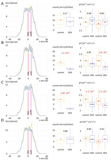 This pattern was also affirmed by the free energy profiles with the apparition of free energy barriers before the ar/R constriction region for chain B and C. A high free energy barrier located at the ar/R constriction was also observed in the control condition of chain D. This could be explained by the propensity of the arginine of the constriction to switch between the up and down conformational states [34,35]. This feature has been observed in several AQPs and seems conserved among the family members [34]. AQP2 especially was recently highlighted as particularly concerned by this phenomenon through molecular dynamics study [40]. However, when pf was used to compare the two conditions, significant difference existed only for chain C. We applied the Dk constant correction on pf (see Supplementary Materials and Figure S1 for details) and restored the response phenotypes observed through water counts: a significant difference between “control” and “DEX” conditions can be observed for chain B and C. These results add evidence in favour of the Dk correction constant that we introduced in our previous work [34].