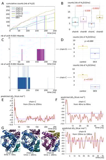 AQP2 interaction with dexamethasone in a biological context mimicking simulation setup. (A) Cumulative number of water molecules crossing the whole 30 Å long transmembrane section of each monomer for the complete 250 ns of trajectory. Dashed lines indicate the subparts of trajectory used for statistical analysis of part D and free energy calculation of part F. (B) Statistical analysis of the water counts (number of water molecules crossing the 30 Å long transmembrane channel per 10 ns subsection of the trajectory). Non-parametric Wilcoxon test with post hoc Bonferroni correction was used to compare the four chains. Significant differences are indicated by dashed lines with the corresponding p value in red italic. (C) Number of hydrogen bonds formed between the dexamethasone molecules and the arginine of the ar/R constriction of chain B and chain C. (D) Impact of the fixation of dexamethasone on the protomer permeability (chain B on top and chain C on the bottom). The “control” and “DEX” conditions are issued from the same trajectory but at different times based on the presence of absence of interaction with the dexamethasone (indicated by dashed lines on part A). They correspond to 40 or 50 nanoseconds of simulation. T test was performed to compare conditions. p values are indicated in italic. (E) Binding free energy of the dexamethasone 228 with AQP2—with which it mainly interacts with chain C extracellular vestibule— from time 25 ns to the end of the trajectory at time 250 ns. Mean free energy is indicated by blue dashed line. (F) Binding free energy for chain B and chain C subsections (40 ns and 50 ns sections, respectively) corresponding to the parts of the trajectory where hydrogen bond is established between dexamethasone and the arginine of the ar/R constriction. Mean free energy is indicated by blue dashed line. (G) Schematic representation of extracellular vestibule of chain B or chain C in interaction with dexamethasone. The arginine of the ar/R constriction is coloured in pink.