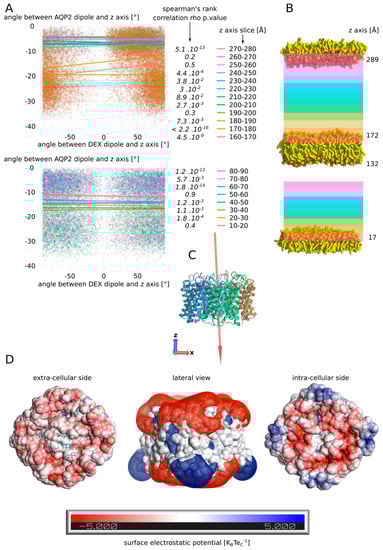 In order to do so, the dipole moments orientation was compressed inside a single variable, chosen as the angle formed between the dipole moment and the z-axis (see Section 2). The correlation between these angle values computed for AQP2 and the dexamethasone molecule was calculated according to the position of the dexamethasone molecule inside the simulated box. For the extracellular compartment, starting from the tetramer surface, we can observe a very significant correlation between the dipole moments for the first 20 Å, followed by higher p values, eventually reaching the point of non-significant correlations in the upper part of the compartment (slices 250–260 and 260–270) before finally going back to a significant association in the last slice (270–280). These observations could be explained by the influence of the dipole moment of the tetramer (1198.98 Debye) upon the smaller dipole (2.93 ± 1.08 Debye) moment of the dexamethasone, correlated with the charge interactions of the molecule with the protein and the membrane. Indeed, in the first 10 Å, the dexamethasone interacted directly inside the vestibule of chain C and was hence stabilized in a preferential orientation. In the next slice however, the very low p value could be the result of a synchronization effect of the small dipole moment of the dexamethasone with the three orders of magnitude higher dipole moment of the tetramer. Then, going further from the protein and higher in the simulated system, this effect would be attenuated by the distance. Finally, the last slice small p value could be the result of a stabilizing interaction of the dexamethasone with the polar head of the POPC. If the dipole moment of AQP2 orients the dexamethasone molecule, then its negative pole would mostly point toward the upper part of the simulated system, while its positive pole would be, on the contrary, mainly orientated toward the bottom part of the system (Figure 8C). This, correlated with the surface charges of the POPC and AQP2, could explain the opposite behaviour of the dexamethasone between the two cellular compartments: in the extracellular compartment, this phenomenon would orient the negative pole of the dexamethasone toward the POPC polar heads, displaying their positively charged choline groups, and its positive pole toward the negatively charged extracellular surface of AQP2 (Figure 8D). In the intracellular compartment, the exact opposite situation could be expected, as the intracellular surface of AQP2 is still mostly negatively charged. This charge repulsion could explain the fact that the correlation was not significant at the vicinity of the membrane, and that there is not enough data to test the correlation near the AQP2 surface (Figure 8A,B and Video S1). Finally, on the extracellular side, the neutral centre of the tetramer probably helps to accommodate the hydrophobic side of the dexamethasone molecules before they reach out one of the monomers vestibules (Figure 8D and Video S1).