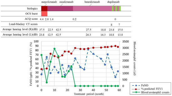 - Hamada, S.; Ogino, E.; Yasuba, H. Cycling therapy with benralizumab and dupilumab for severe eosinophilic asthma with eosinophilic chronic rhinosinusitis and eosinophilic otitis media. Allergol. Int. 2021, 70, 389–391. [Google Scholar] [CrossRef] [PubMed]