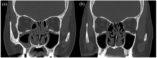 Sinus CT before and after sequential biotherapy: (a) before sequential biotherapy, (b) after sequential biotherapy for 7 months.
