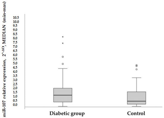 In the control group, miR-107 expression was significantly different (p = 0.001 based on the Mann-Whitney test) between genders (median [25–75%]): 1.72 [0.65–4.06] for men and 0.46 [0.18–1.35] for women. In the diabetic cohort, a correlation between higher miR-107 expression and male gender (r = 0.395, p = 0.05) was found. In general, the male gender is related to higher miR-107 expression (p = 0.002).