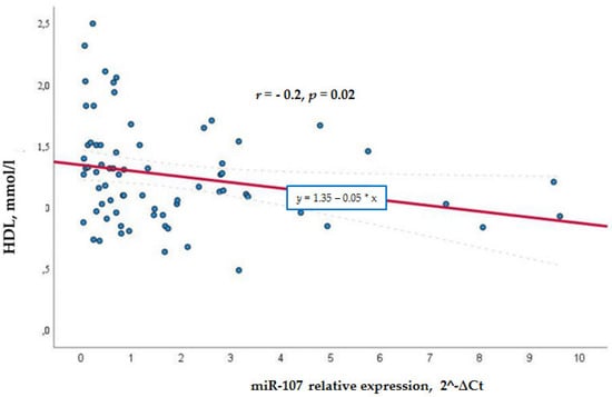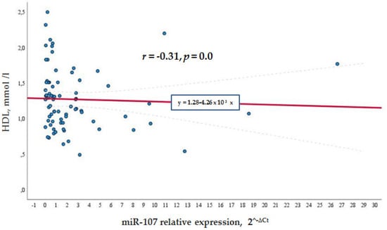 For a deeper analysis of dyslipidemia risk factors, BMI, HOMA-IR, and miR-107 levels were evaluated in relation to lipid levels. BMI correlated with the total cholesterol level r = −2.37 (p = 0.041), HDL level r = −0.493, p < 0.001, and with triglycerides r = 0.365, p = 0.002. HOMA-IR correlated with the total cholesterol level r = −0.401, p = 0.009, LDL level r = −0.331, p = 0.032, and HDL r = −0.428, p = 0.005. However, triglycerides did not demonstrate a relation with HOMA-IR.