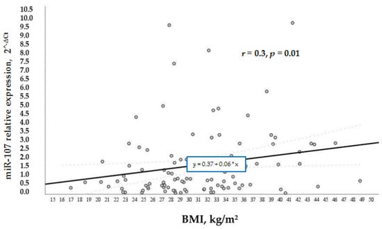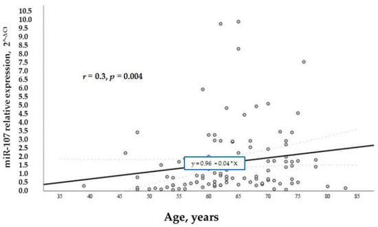 According to our study aims, we wanted to analyze other factors that regulated the levels of miR-107 in general and in the test groups. We analyzed the relation of various factors (BMI, age, and gender) with miR-107 expression. It was found that miR-107 expression was directly and positively associated with BMI (r = 0.3, p = 0.01) (Figure 4) and age (r = 0.3, p = 0.004) (Figure 5) in the whole sample. While BMI did not demonstrate a significant association with miR-107 in the separate groups, we speculate that it is due to the small number of participants in each group.